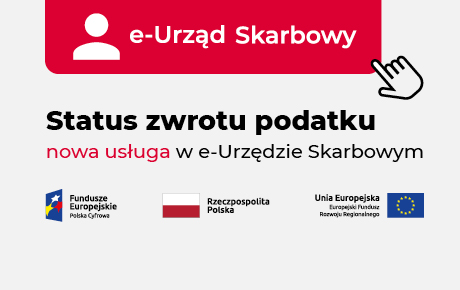 Grafika z logo e-Urzędu Skarbowego, logotypami funduszy Europejskich, flagami Polski i Unii Europejskiej i napisem status zwrotu - nowa usługa w e-Urzędzie Skarbowym