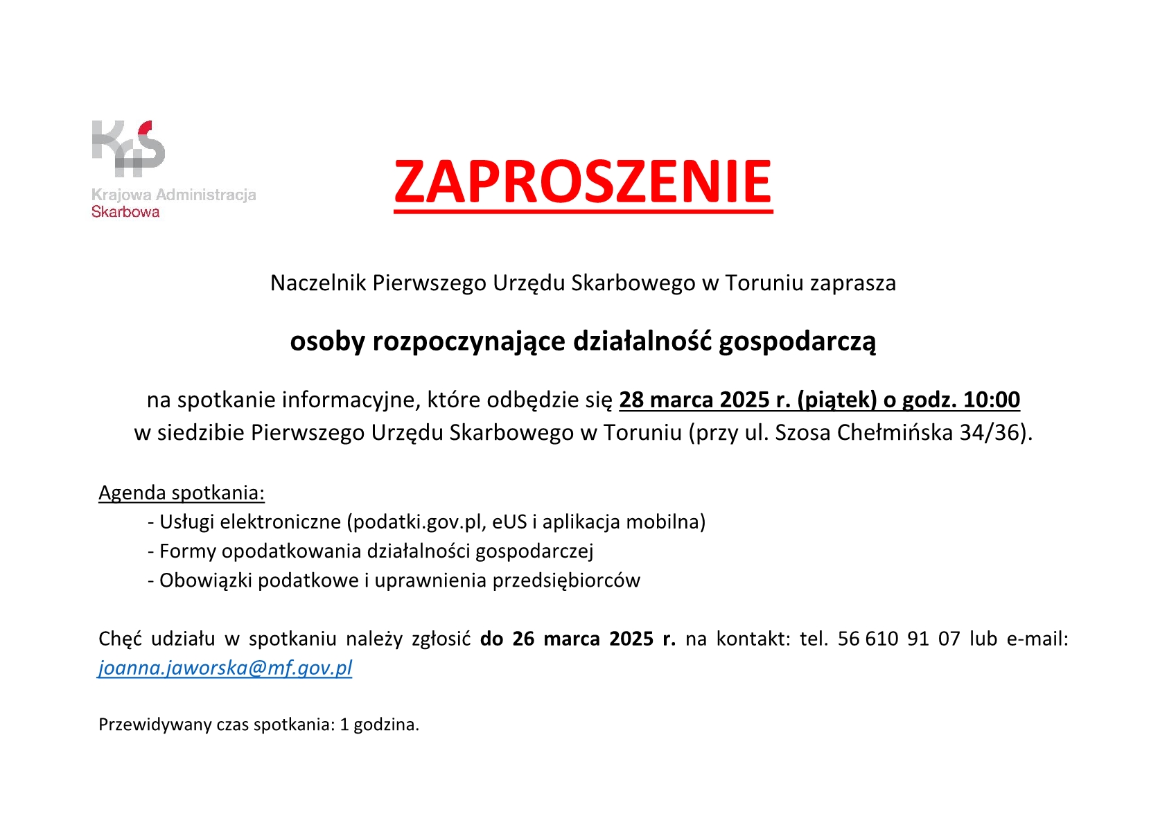 Chęć udziału w spotkaniu należy zgłosić do 26 marca 2025 r. na kontakt: tel. 56 610 91 07 lub e-mail: joanna.jaworska@mf.gov.pl