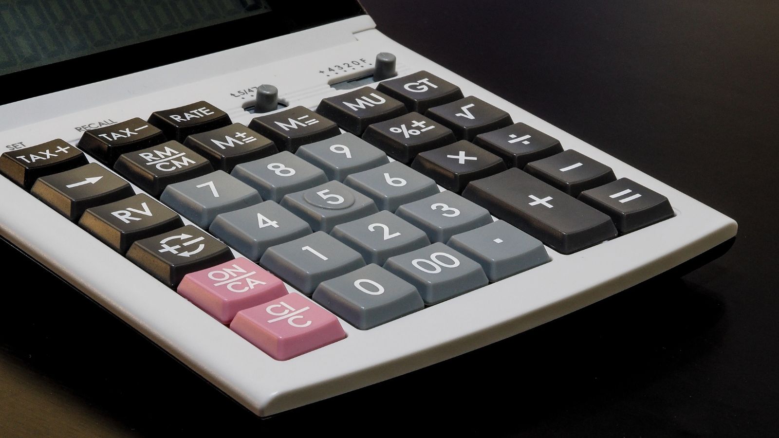 Kalkulator leży na biurku lub stole.